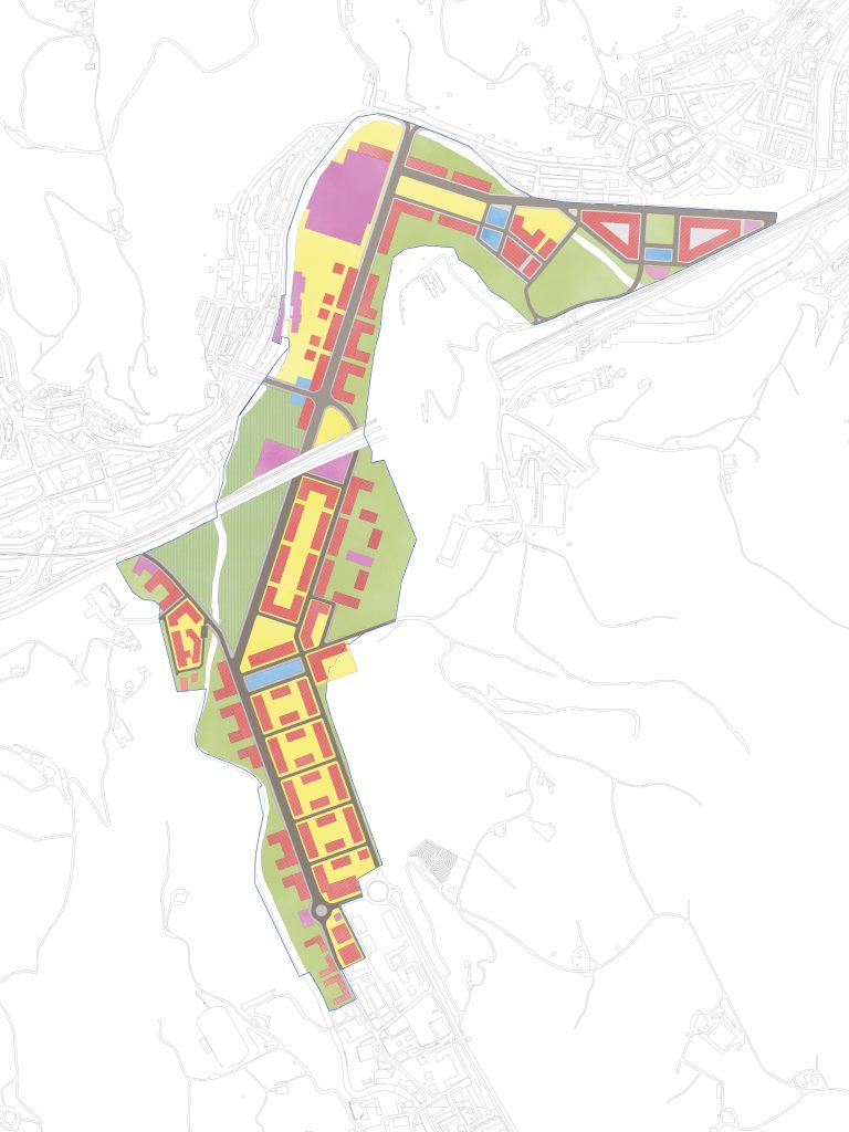 La imagen muestra una propuesta de desarrollo urbanístico para la zona de BOL, combinando un modelo en 3D con una vista aérea del área. Esta superposición permite visualizar cómo se integrarían los nuevos edificios, zonas verdes y vías con el entorno actual. El planteamiento busca dar forma a un barrio funcional, bien conectado y con buena calidad de vida, respetando el paisaje y reforzando sus valores existentes.